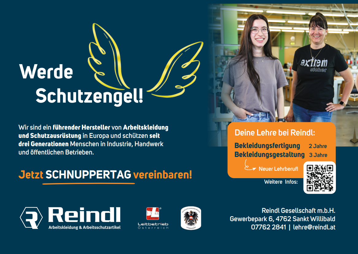 Als einer der führenden Hersteller für Arbeitskleidung und persönliche Schutzausrüstung in Europa, schützen wir seit über 60 Jahren das Leben von Arbeiter/innen in Industrie-, Gewerbebetrieben sowie öffentlichen Einrichtungen. Reindl beschäftigt in St. Willibald im Innviertel ca. 100 Mitarbeiter, die in den Bereichen Entwicklung, Marketing, Vertrieb, Beschaffung, Produktion, Lager und Verwaltung tätig sind.